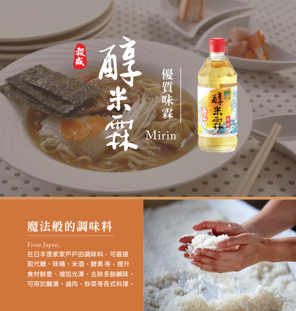 醇米霖(Mirin)可取代砂糖、味精、使料理美味可口甜而不膩,改善食物中的口感、腥味、更可增加食物香氣及光澤度,因此能在日式調味品中成為後起之秀崛起。