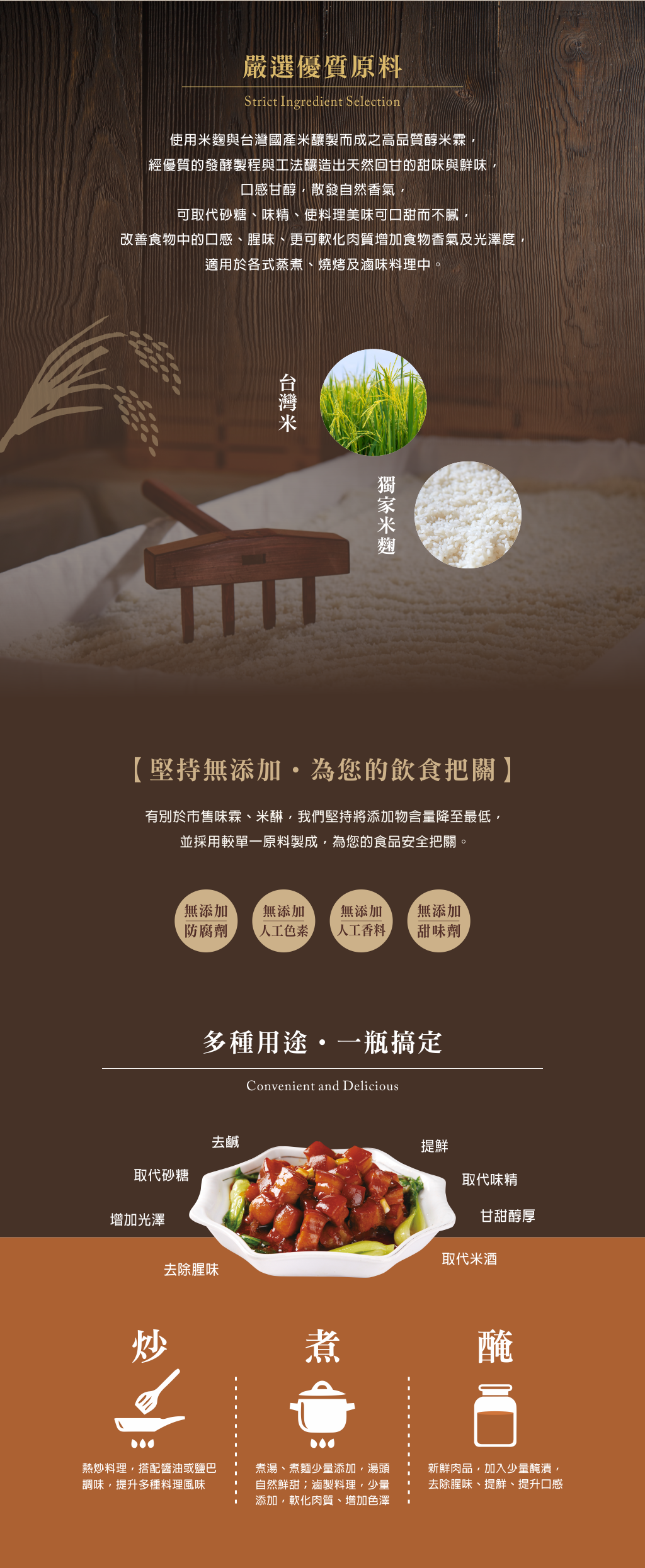 醇米霖又稱米淋(Mirin),是最先進的和風醱酵調味品,其主要成份為糯米,因釀造時所產生的甘甜和酒香,連一般砂糖、味素均望塵莫及,故早年專為日本皇室貴族享用,如今更已是家家戶戶及各類食品加工廠所深愛使用。