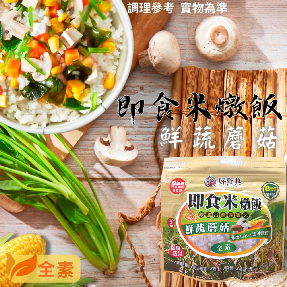 蔬菜包:蘑菇片、非基因改造玉米粒、菠菜、紅蘿蔔丁